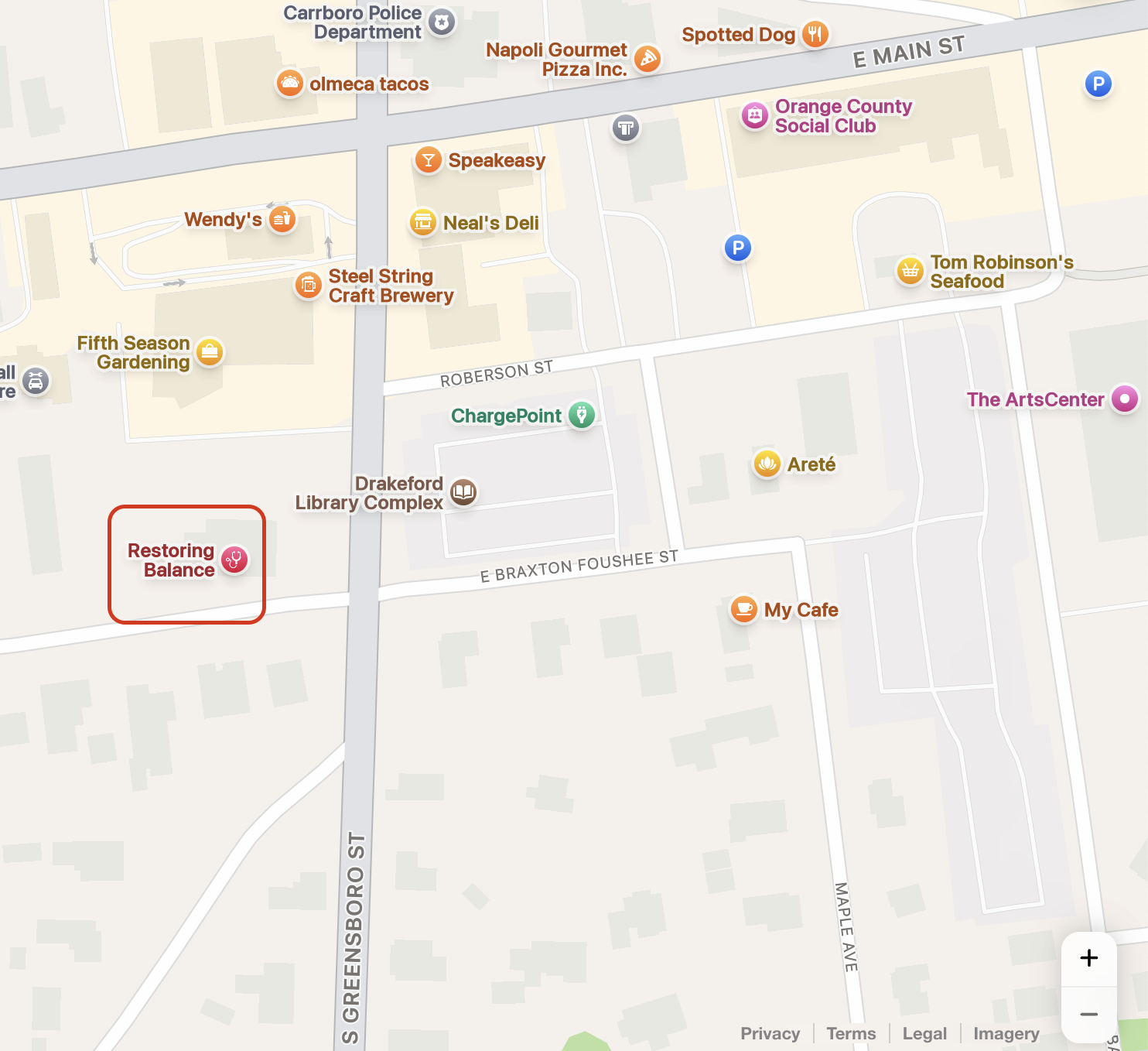 We are located directly across from the Drakeford Carrboro Library, next to Porch Chapel Hill, and diagonal from Open Eye Cafe.